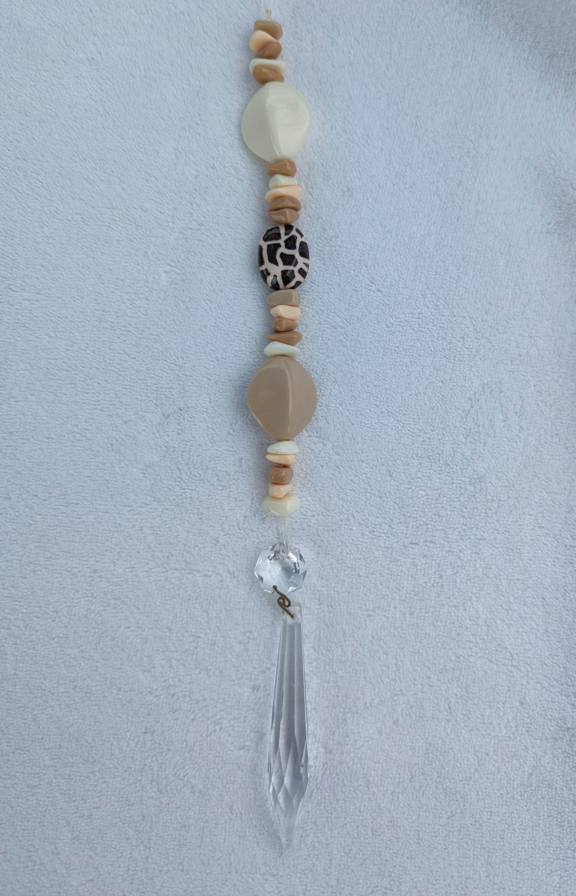 Prism designed from an antique chandelier crystal and up-cycled jewelry and beads. Each one is unique. This one is designed from a clear crystal. The primary colors are beige and white including a turtle print bead, plus a variety of beads. Length of Prism including crystal is approximately 11 inches.