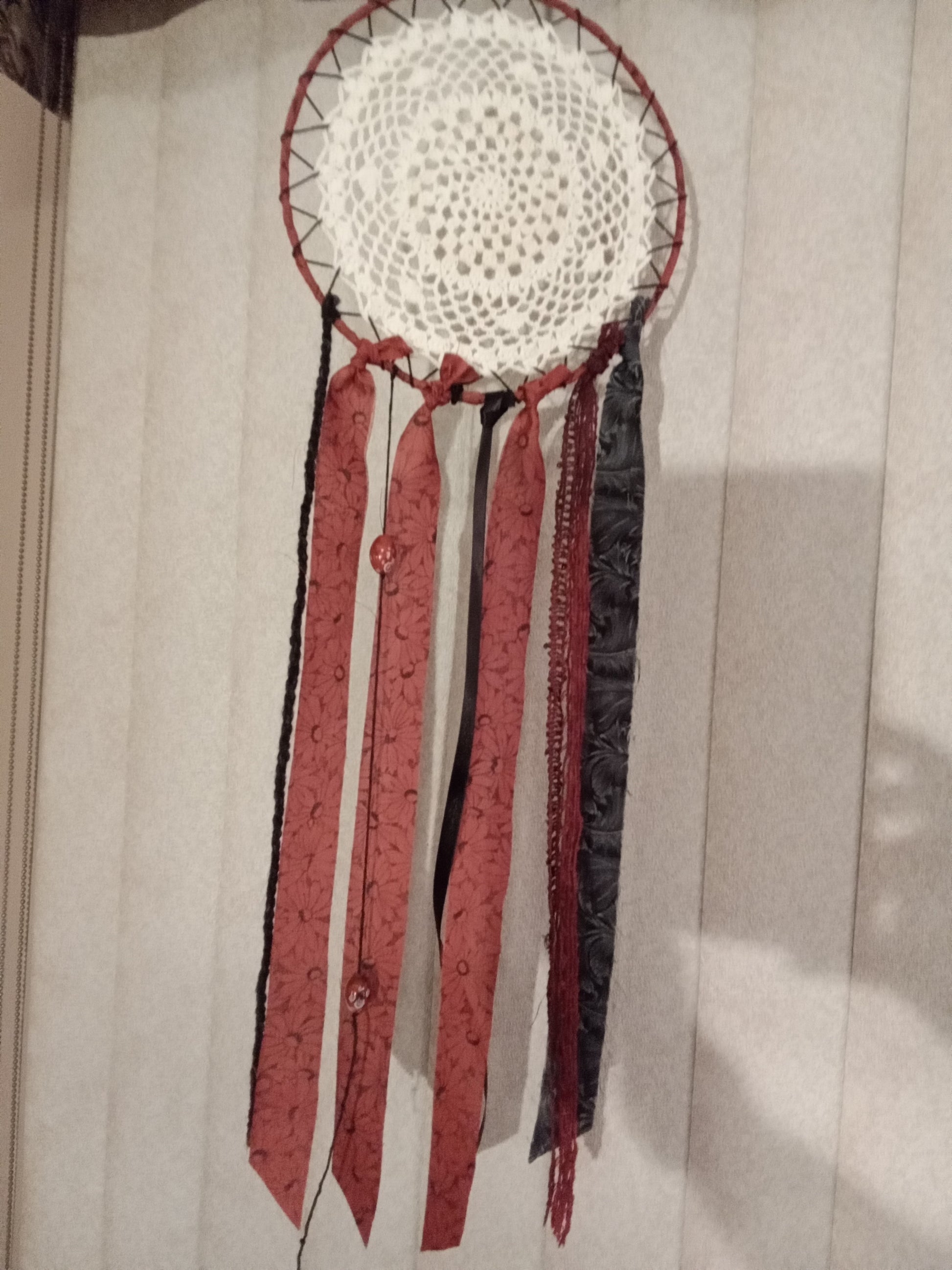 Our Dream Catchers are designed with unique design with green bead in the center. This dream catcher includes moon and star print material and other recycled material pieces with a moon charm. The ring measures 8 inches in diameter.