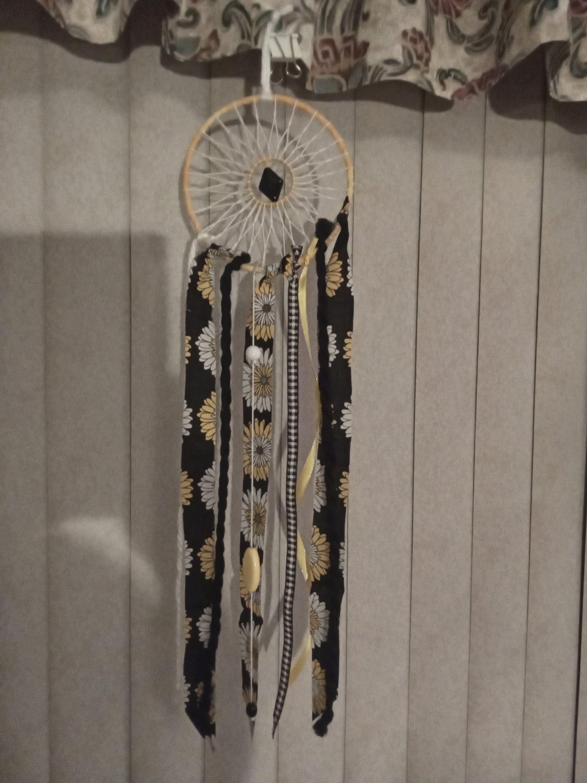 Our Dream Catchers are designed uniquely with a center black bead. This dream catcher includes flowered material, other recycled material pieces, and yellow, white, and black bead charms. The ring measures 6 inches in diameter.