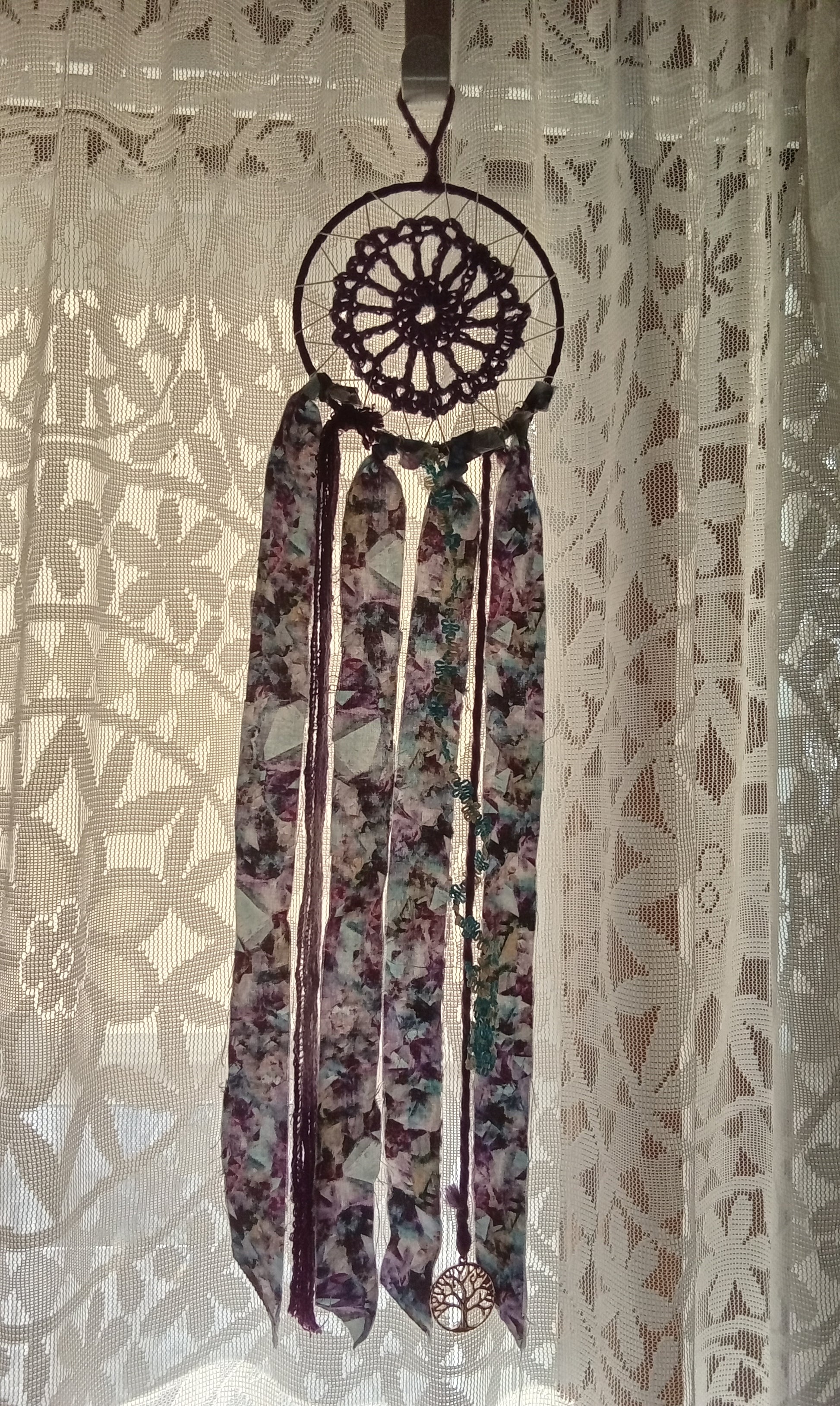 Dream Catchers are designed uniquely with an up-cycled doily. This dream catcher includes a purple center doily and purple material that looks like crystals. Ring is 5.0 inches in diameter. Each has a special charm.