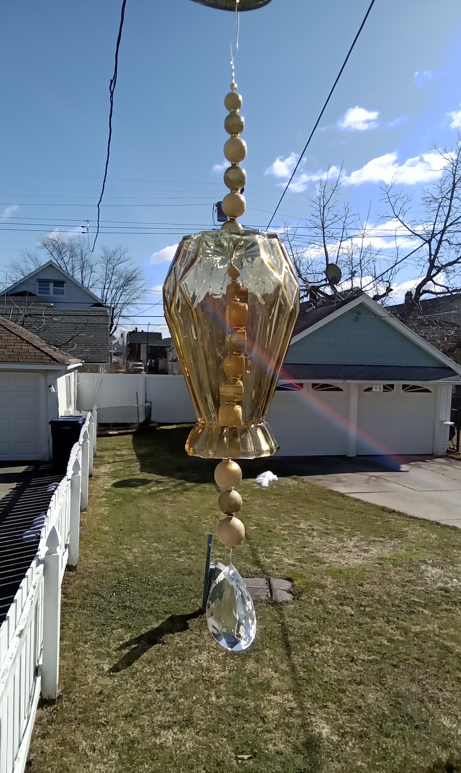 Garden, Patio, Bay Window Chime designed with recycled glassware, jewelry and an antique chandelier crystal. Each one is unique. This one is designed from a medium crystal prism, gold glassware, and green and gold jewelry beads.