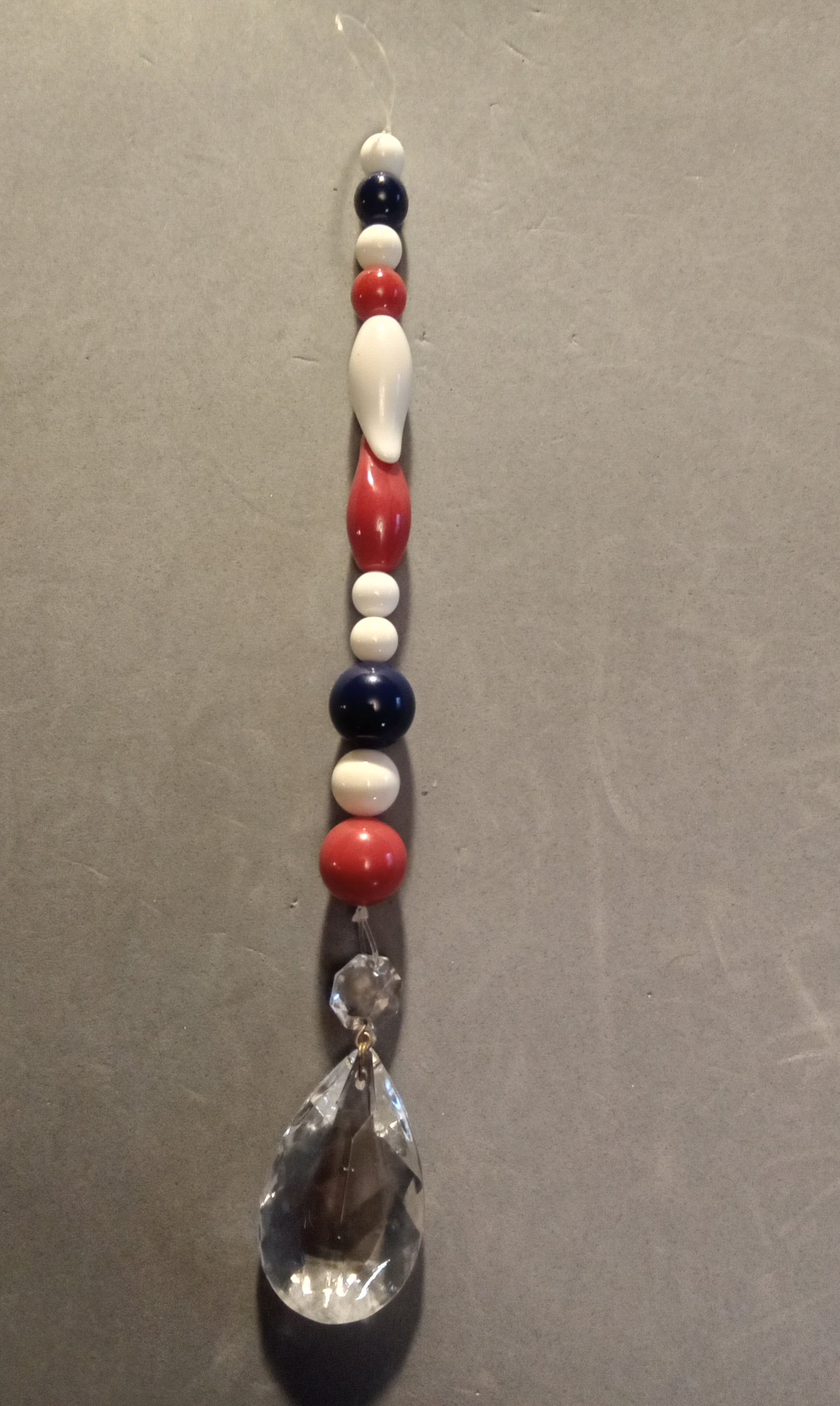 Prism designed from an antique chandelier crystal and up-cycled jewelry and beads. Each one is unique. This one is designed from a clear crystal. The primary colors are red, white, and blue beads. Prism including crystal is approximately 11 inches.